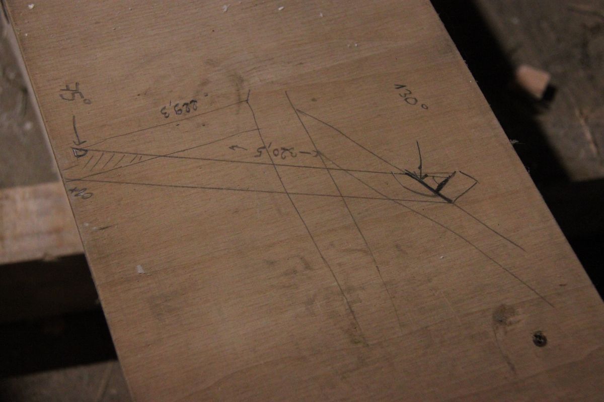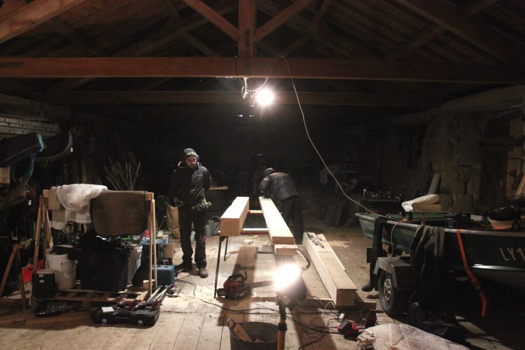 L'endroit, c'est donc une grange qui abrite des piquets de clôture, du matériel d'équitation, une barque et des cannes à pêche. Yoann et Gaspard m'expliquent la nature de la réparation qu'ils ont à effectuer. Un entrait, soit la poutre horizontale qui forme la base d'une ferme, s'est fendu au niveau d'un nœud, près de son point d'appui sur un mur porteur, fragilisant toute la structure. Pour le consolider, les deux travailleurs entendent placer un poteau sous la partie endommagée, qui sera fixé à l'entrait et à l'arbalétrier à l'aide d'une jambe de force. Peu familier du vocabulaire de la charpente, je peine d'abord à me représenter la marche à suivre. Un schéma, dessiné sur une chute, m'y aide.