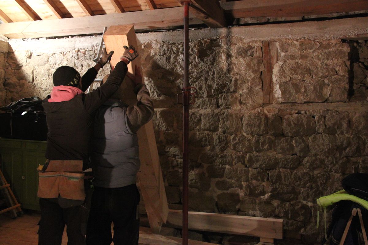 Trêve de bavardages cependant : les découpes effectuées, les deux acolytes passent à la pose et à la fixation des pièces. Le poteau, d'abord, qu'il faut installer en force sous l'entrait à coups de masse, puis les deux pièces qui constituent la jambe de force. Après quelques ajustements, celles-ci sont moisées : elles enserrent la pièce à soutenir, à laquelle elles sont associées par boulonnage. Voici donc ce que peuvent devenir, parmi de nombreuses autres possibilités, les sapins du Meygal une fois abattus et transformés.