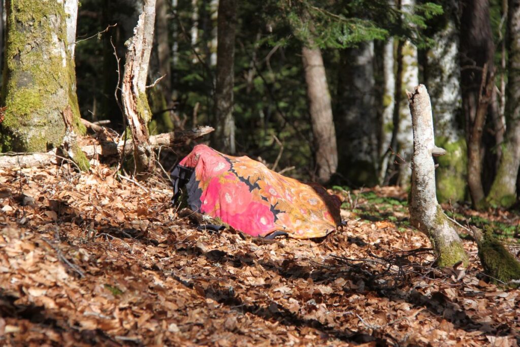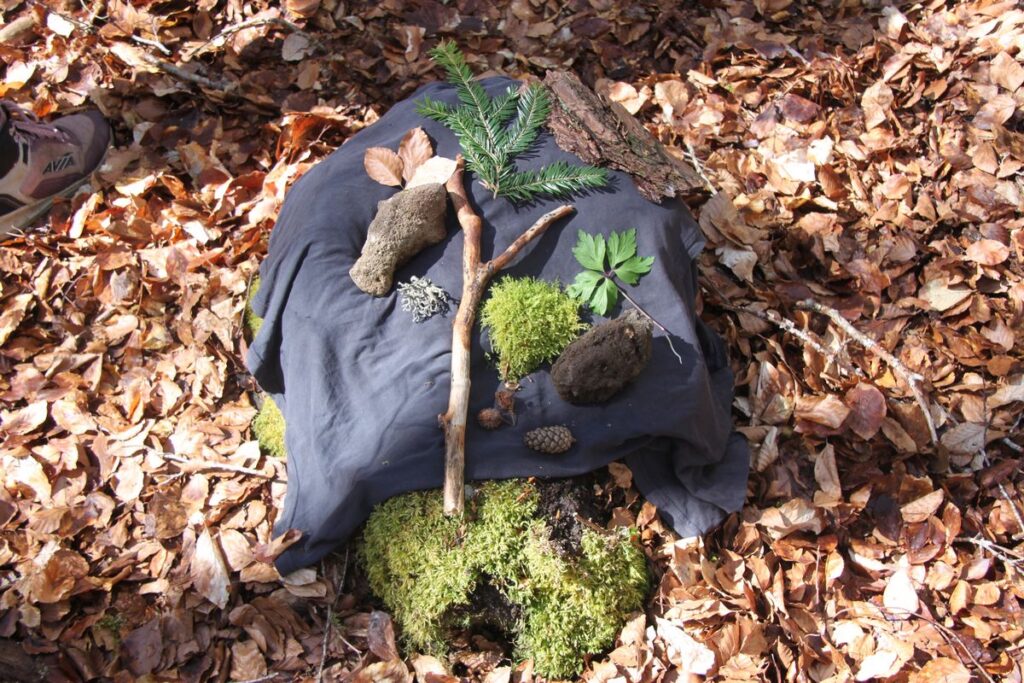 Les enfants commencent à entourer un petit paquet qui est apparu entre les arbres. Un foulard le recouvre. Qu'est-ce qu'il cache ? Elsa renforce le mystère. C'est un trésor. Le trésor de la forêt. Aussitôt, elle retire le voile. Dessous, des feuilles, de la mousse, des pierres, des faînes et des pommes de pin : autant d'éléments récoltés durant la balade. Divisés en deux groupes, les enfants doivent mémoriser le trésor qui leur a été montré puis le recomposer en glanant autour d'eux ce qui le compose. Ça n'est bientôt plus un, mais bien trois trésors qui sont constitués les uns à côté des autres. Peut-être certains en ont-ils profité pour s'en mettre plein les poches... De retour à la lisière des bois, le cercle se reforme. Il se resserre vers son centre, se détend, se resserre encore puis finit par éclater en un grand applaudissement : la sortie prend joyeusement fin. Elsa et Yoann en profitent tout juste pour annoncer les prochaines balades organisées par l'association : l'une à la fin du mois de mai, consacrée à l'écologie de la forêt ; l'autre durant l'été, consacrée à la gestion forestière.